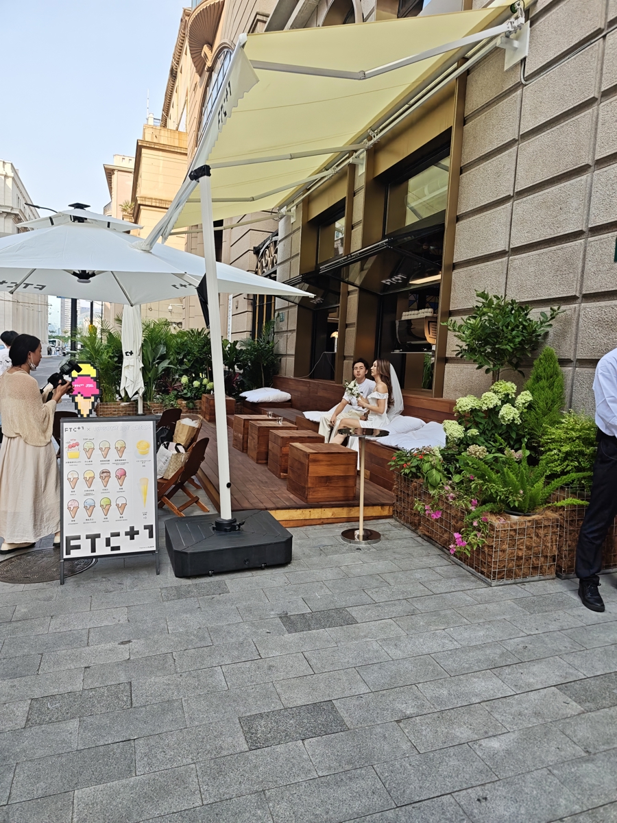 座位有了,故事也就来了。陈萌手机里,保存了很多外摆位上的照片。这个向市民游客开放共享的空间,有新人来拍婚纱照,也有外卖小哥、环卫工人歇歇脚,外地游客走过路过也忍不住驻足。